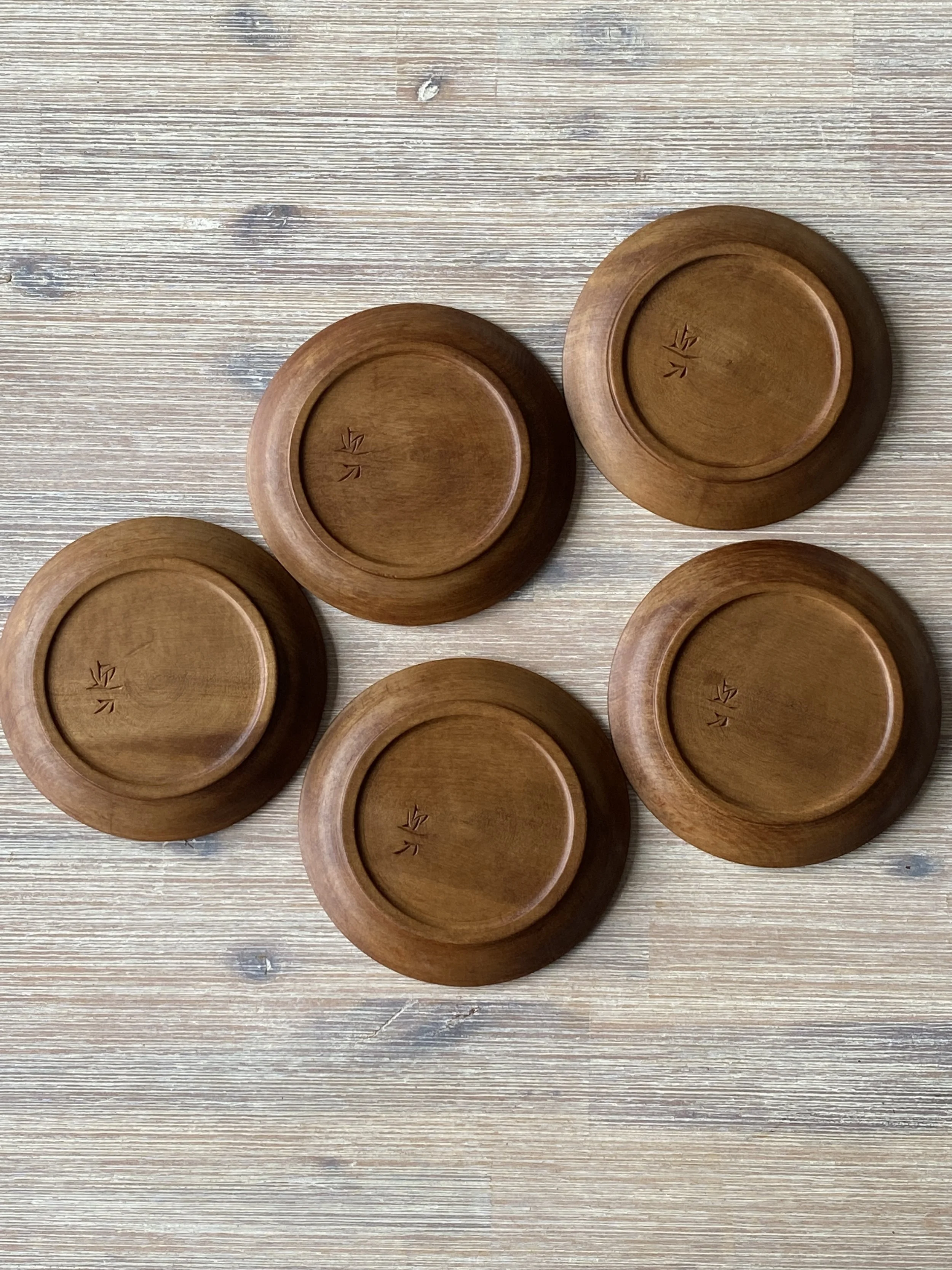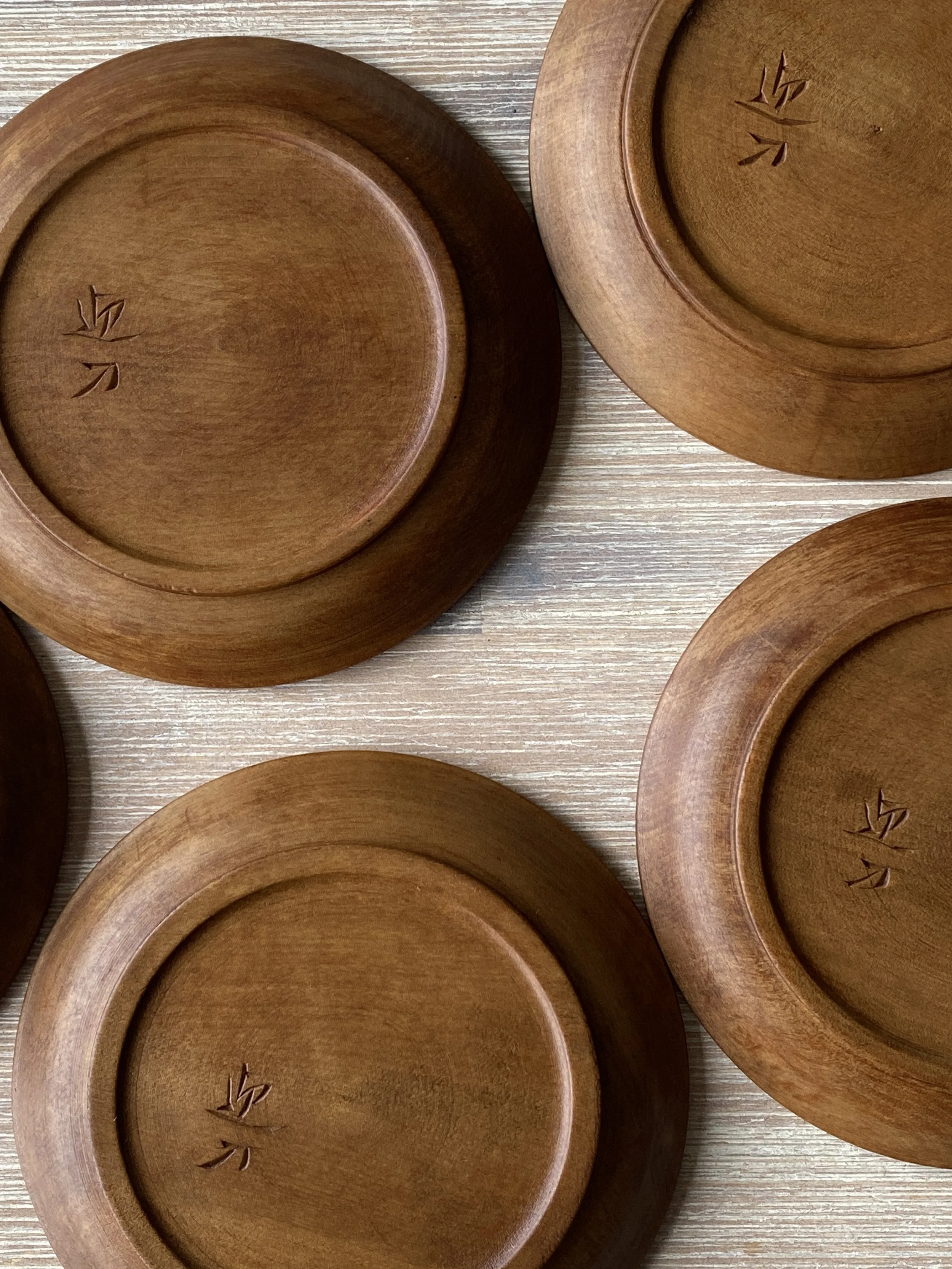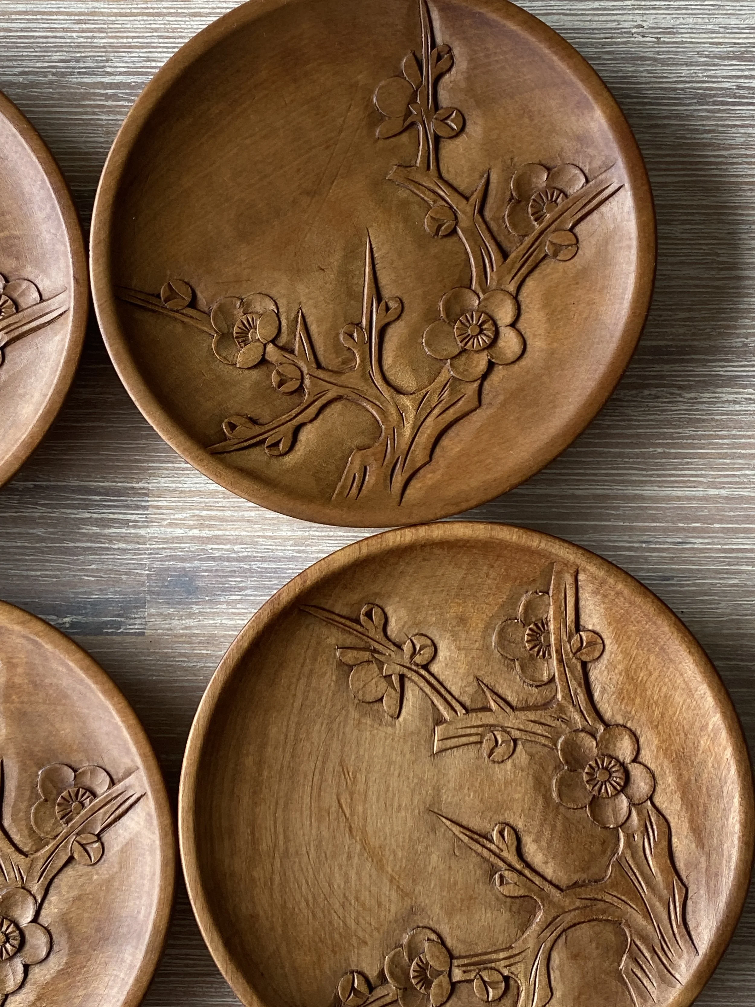 While Kamakura-bori traditionally involves layering lacquer over carved wood, although rare, some artisans choose to leave the wood unlacquered to highlight the natural carved surface, as seen in these dishes